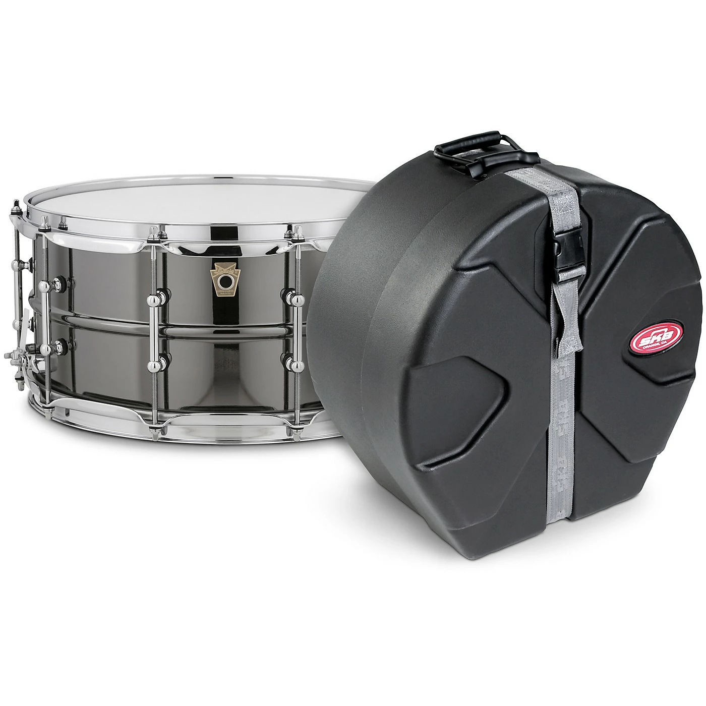 The legendary Black Beauty Snare Drum from Ludwig is constructed of a single sheet of brass that is machine drawn and spun into a seamless beaded shell, then nickel-plated with a beautifully exquisite finish. An American original, the Black Beauty provides a warm, round metallic tone that is often imitated, but never duplicated. This model features tube lugs for a precise and sure tune, while SupraPhonic snare wires aid the classic Black Beauty attack. A drum case is also included for portable protection between gigs. The revolutionary SKB Roto-Molded D-shaped drum case has molded-in feet for upright positioning and stability, patented Roto-X pattern for durability and reliable stacking. Sure-grip handles with a 90 stop allow for easy lifting and transporting of drums while sturdy, high-tension slide-release buckle and heavy-duty web strap ensure totally reliable closure. Fabric-covered foam inserts securely cradle the drum with maximum protection.