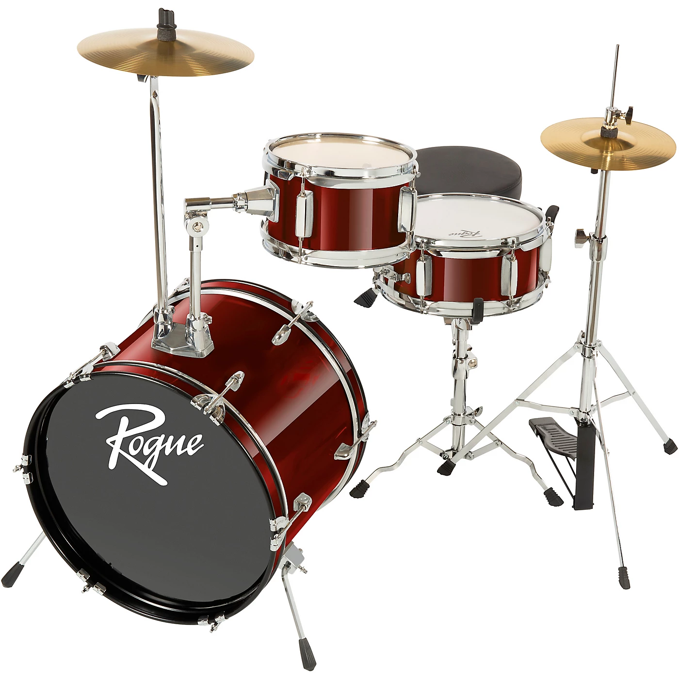 The Rogue Lil’ Kicker 3-Piece Drum set is a complete drum set especially designed for young drummers with a full-size passion for music. It’s built to the same standards as full-size set with real multi-ply wood shells, fully tunable and replaceable top and bottom heads, and sleek chrome hardware and accents. The Lil’ Kicker’s “all-in-one” configuration comes complete with everything you need to start rockin’ right out of the box — including bass drum, snare, tom, stands, cymbals, throne, bass drum pedal, tuning key and even a pair of sticks.